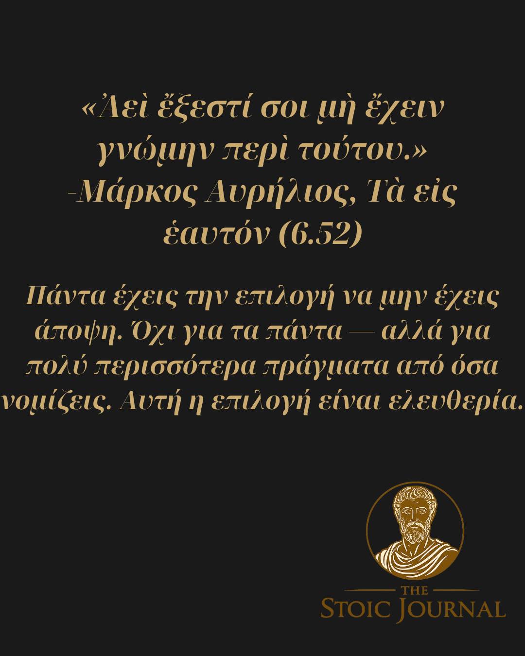 Φαντάσου τον αυτοκράτορα της Ρώμης. Εκατομμύρια υπήκοοι, πόλεμοι στα σύνορα, αποφάσεις που καθορίζουν ιστορία. Και ο Μάρκος κάθεται σε μια συνεδρίαση της Συγκλήτου δίπλα σε κάποιον που μυρίζει. Δεν το γράφει για να γελάσει. Το γράφει γιατί τον ενόχλησε αρκετά ώστε να χρειαστεί να το επεξεργαστεί. Ο ίδιος άνθρωπος που διοικούσε αυτοκρατορία παλεύει με τον ίδιο μικρό εκνευρισμό που παλεύεις κι εσύ στο μετρό. Και καταλήγει στο ίδιο συμπέρασμα: μίλησέ του ή άφησέ το. Δεν υπάρχει τρίτη επιλογή. Το να κάθεσαι και να βράζεις δεν είναι επιλογή. Είναι σπατάλη. Ο Κάτων ήταν γνωστός για την αυστηρότητά του. Δεν συγχωρούσε εύκολα, δεν έκανε εκπτώσεις, είχε άποψη για τα πάντα. Και όμως. Όταν ο Καίσαρας ανέβαινε στην εξουσία και ο κόσμος γύρω του αγανακτούσε, ο Κάτων δεν σπαταλούσε ενέργεια σε κάθε μικρή αδικία, σε κάθε μικρή προσβολή, σε κάθε κουτσομπολιό της Συγκλήτου. Επέλεγε τις μάχες του. Τα υπόλοιπα τα άφηνε να περνούν. Γιατί ήξερε ότι ο άνθρωπος που αντιδρά σε όλα δεν έχει δύναμη για τίποτα. Ο Μάρκος παλεύε με τα μικρά. Ο Κάτων τα αγνοούσε για χάρη των μεγάλων. Και οι δύο φτάνουν στο ίδιο σημείο. Σκέψου πόσες φορές την τελευταία εβδομάδα εκνευρίστηκες με κάτι που δεν θα θυμάσαι σε έναν μήνα. Ο οδηγός που σε έκοψε. Ο συνάδελφος που είπε κάτι ηλίθιο στη σύσκεψη. Το σχόλιο στο Facebook που δεν έπρεπε να διαβάσεις. Η σειρά στο σούπερ μάρκετ που δεν κουνιόταν. Ο γείτονας με τη μουσική στις 11 το βράδυ. Σε κάθε μία από αυτές τις περιπτώσεις, είχες άποψη. Έκρινες. Εκνευρίστηκες. Ίσως είπες κάτι ή ήθελες να πεις. Ίσως το κουβαλάς ακόμα. Αλλά ποιος πλήρωσε το τίμημα; Ο οδηγός δεν σκέφτεται εσένα. Ο συνάδελφος συνεχίζει τη μέρα του. Ο γείτονας κοιμάται ήσυχος. Εσύ είσαι αυτός που κουβαλάει το βάρος μιας κατάστασης που τελείωσε εδώ και ώρες. Δεν έχεις επιλογή να σταματήσεις τον κόσμο να σε ενοχλεί. Αλλά έχεις επιλογή να αρνηθείς να δώσεις άποψη σε ό,τι δεν αξίζει άποψη. Ο Μάρκος έπρεπε να το θυμίζει συνεχώς στον εαυτό του. Εσύ δεν είσαι λιγότερος άνθρωπος επειδή παλεύεις με το ίδιο. «Αν αφήνω τα πάντα, γίνομαι αδιάφορος. Χάνω τον εαυτό μου.» Όχι. Το να αφήνεις τα μικρά δεν σημαίνει ότι αδιαφορείς για τα μεγάλα. Σημαίνει ότι ξέρεις να τα ξεχωρίζεις. Ο Κάτων δεν άφηνε τα πάντα. Άφηνε αυτά που δεν άξιζαν τον αγώνα για να έχει δύναμη για αυτά που άξιζαν. Αυτό δεν είναι αδιαφορία. Είναι στρατηγική επιλογή του πού θα ξοδέψεις τον εαυτό σου. Η ενέργειά σου είναι πεπερασμένη. Κάθε φορά που την ξοδεύεις σε κάτι που δεν αξίζει, την αφαιρείς από κάτι που αξίζει. Σήμερα, διάλεξε ένα πράγμα που σε ενόχλησε, κάτι μικρό και αποφάσισε συνειδητά να μην έχεις άποψη γι' αυτό. Μην το αναλύσεις, μην το συζητήσεις, μην το κουβαλήσεις. Άφησέ το να υπάρχει και να περάσει. Παρατήρησε τι νιώθεις μετά. Καλή δύναμη. The Stoic Journal |